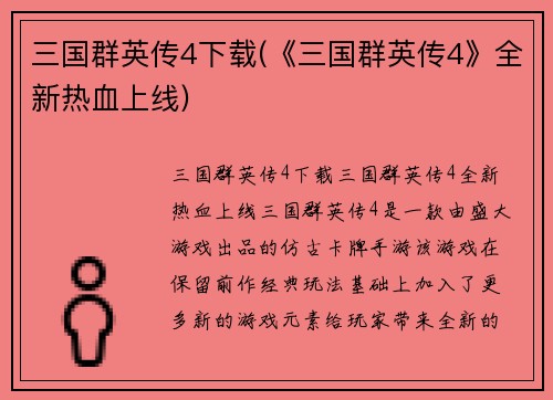 三国群英传4下载(《三国群英传4》全新热血上线)