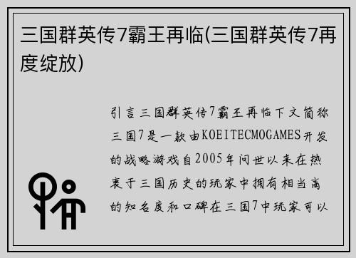 三国群英传7霸王再临(三国群英传7再度绽放)